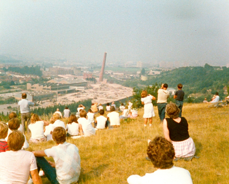 There must have been more photographs taken on Troopers Hill on 12th August 1984 than on any other date. Roy was one of the many people on Troopers Hill that Vernon could see from his view point - see Set A. This is the moment as the 300 feet chimney at the Board Mills fell. Comparison with the August 2007 view shows how much the woodland onn the west side of the hill has grown. |