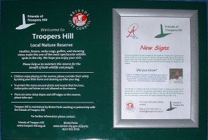 The Action Plan includes the installation of two notice boards and small signs at each of the five entrances to the hill. In consultation at meetings and on Work Parties it was decided that a better option was to combine these two and provide spaces for A4 notices on signboards at each entrance, the result can be seen here. These have been fixed to the fence at each entrance to the hill at our Work Parties over the last few months. The signs were supplied by Wards of Barton Hill. |