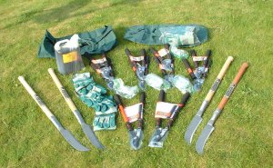Before receiving the grant we had borrowed tools for our Work Parties from Avon Wildlife Trust, so the money for tools and protective equipment was the first to be spent. The photograph shows some of our new tools including loppers and slashers. We have also bought bow saws, rakes, a sledge hammer and a pickaxe. |