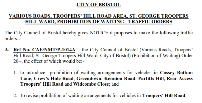 There were three separate sections to the TRO - parts A, B & C. For Troopers Hill Road part A was for parking restrictions and part C was for speed humps etc, you need to look at both to get the full picture. Part B was for other parking restrictions in around the Kingsway.