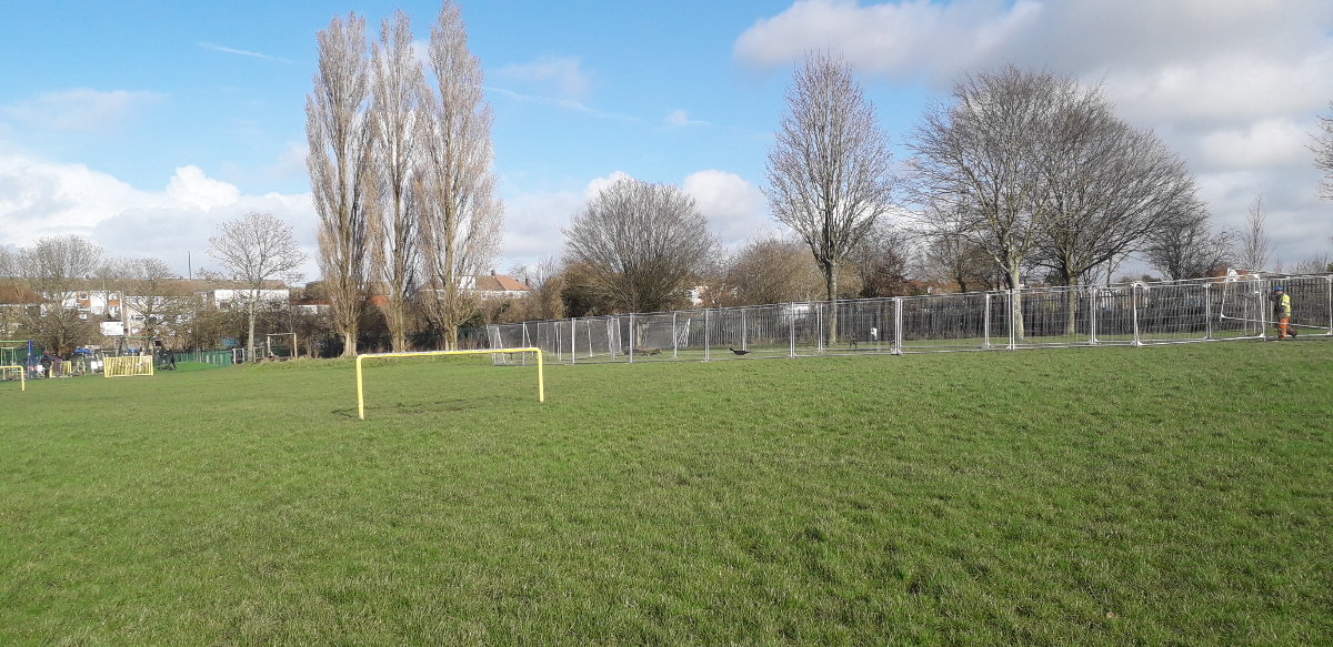 Herras fencing being erected on the line of the new path, 17th February 2020.