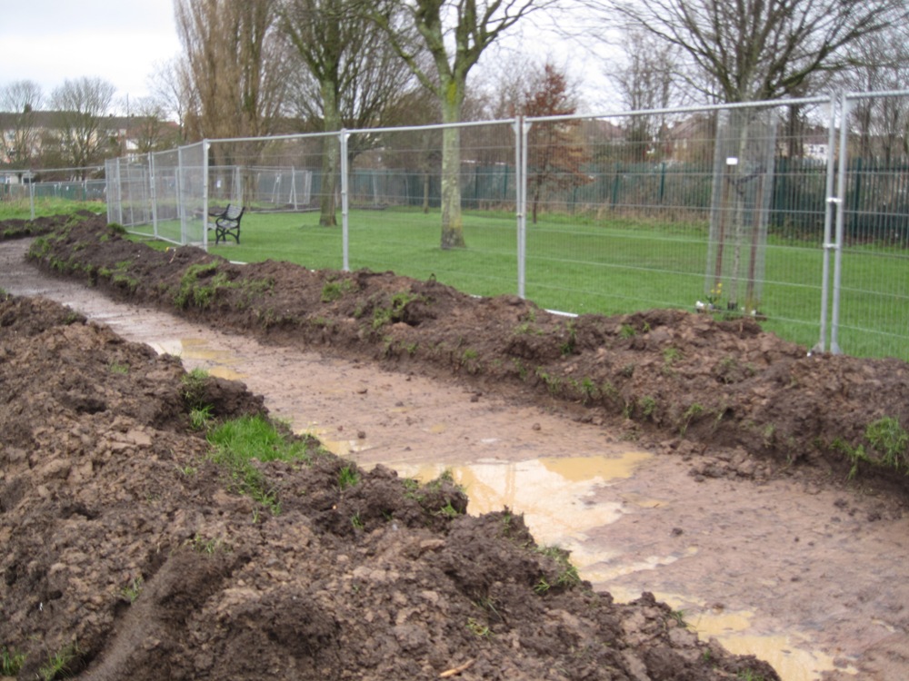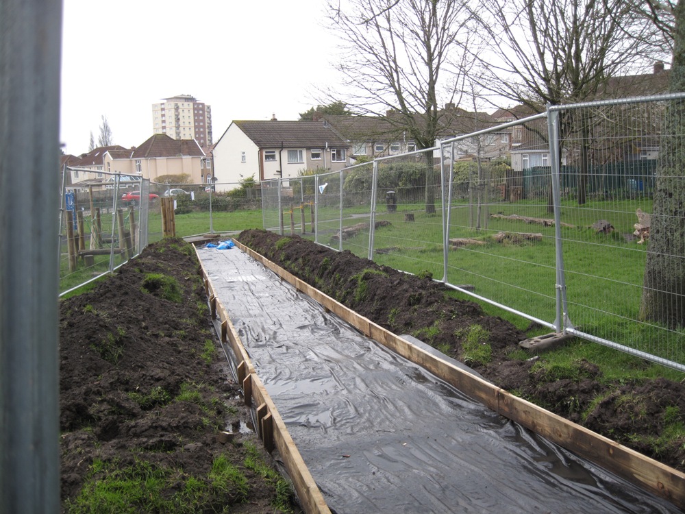 The east side of Troopers Hill Field, beside the allotment fence is a favourite route for walkers to access Troopers Hill but it becomes very waterlogged and muddy in winter. An investigation by students before work started in 2020 proved that this was rainwater that was unable to penetracte the clay capping placed when the Field was part of Malvern Road Tip.