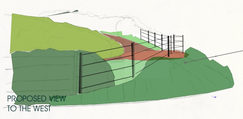 The type of fence to be used was the main subject of discusion, with the concensus being that we should use 'Estate Fencing' of the same type that has been installed at Callington Road Nature Reserve . The plans for the Greendown entrance were approved at our meeting in January, a sketch view and plan are shown below (click on the images to enlarge). The main aims of the design are to allow easier access for families with pushchairs and to make the entrance safer by moving the access point away from the road junction and futher up Greendown. Once the design was agreed our designer produced detailed costings.