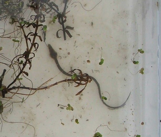 For our session looking at amphibians and reptiles we visited Eastwood Farm just over the river. Although we didn't actually see any amphibians or reptiles we learnt a lot about the type of environment they prefer. We focused particularly on the lagoon and considered whether it would be suitable for Great Crested Newts, the presence of fish seemed to be the only negative factor. While pond-dipping we found this, which we believe to be an elver.