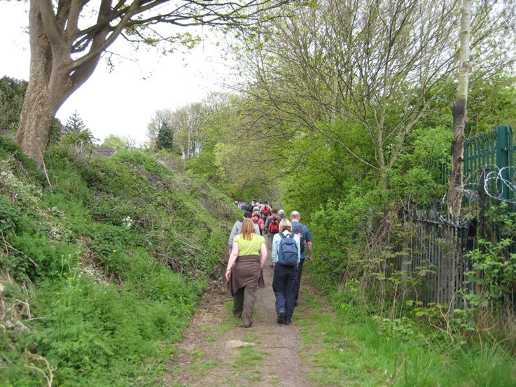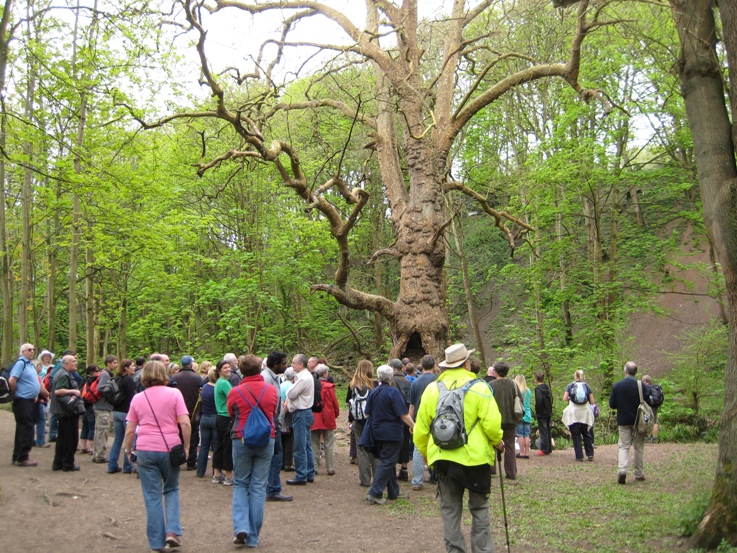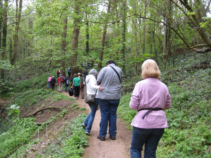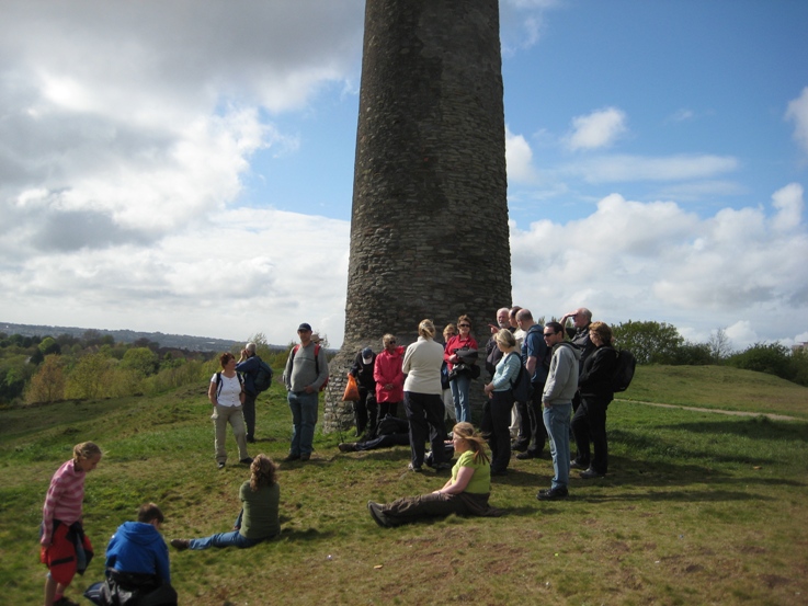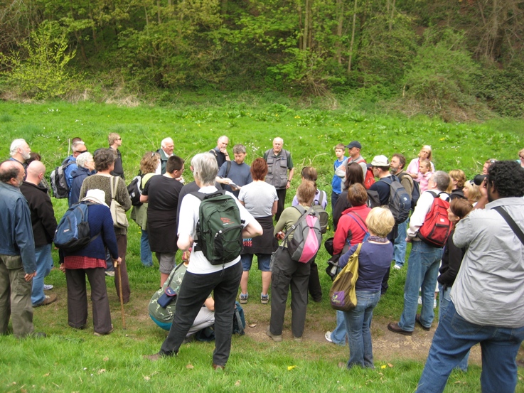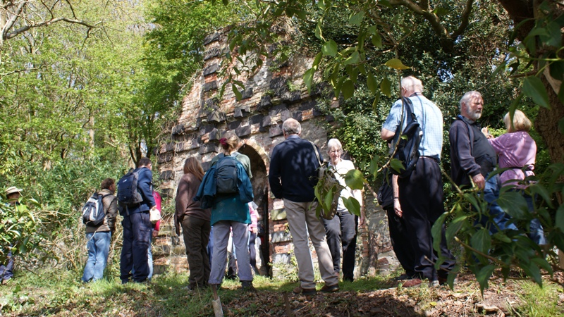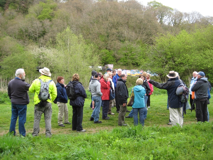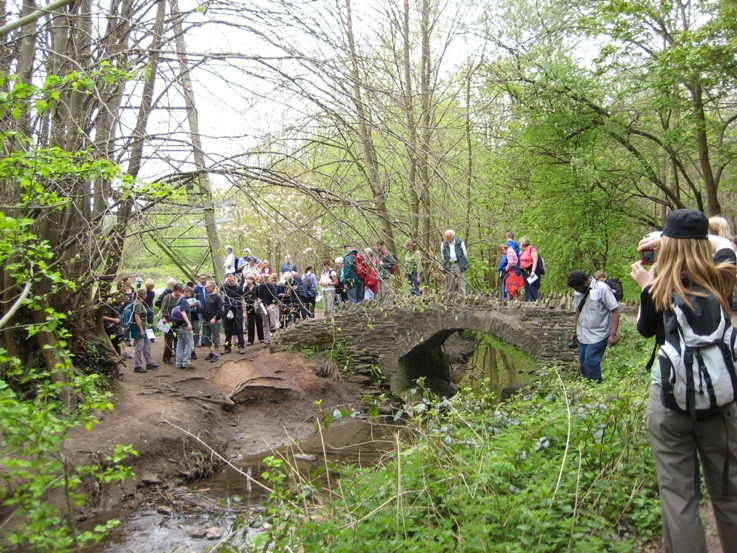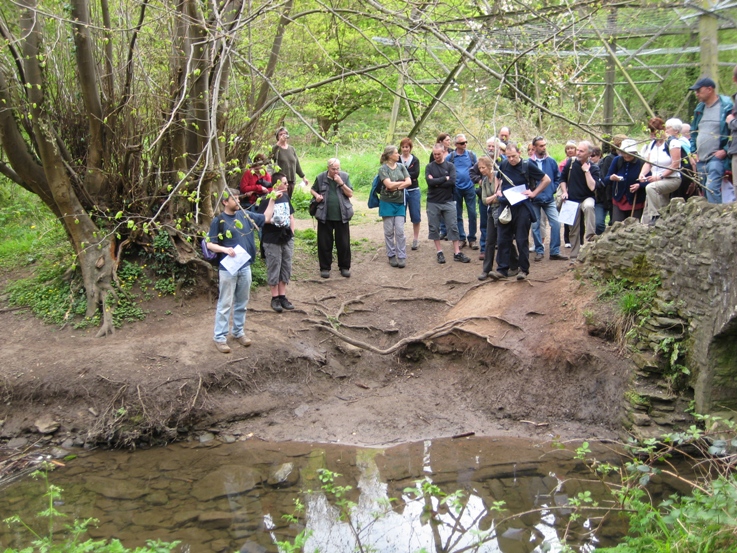 Friends of Troopers Hill again joined with South Bristol Riverscapes Project for a guided walk through the valleys of the Avon and the Brislington Brook. The walk was fully booked and on a cloudy but warm spring morning 40 people set out from Troopers Hill. We were fortunate to be able to start the walk with a visit to the Bath house hidden in the woods on private land. You can see a video of an earlier visit on our Video Project page. For the next section of the walk along Brislington Brook we were joined by the Brislington Community Archaeology Project and Peter Insole, Archaeology Officer for Bristol CC, who talked about some of the fascinating archaeological features along the brook. Lunch at Beeses Riverside Bar & Tea Gardens was followed by a walk around Eastwood Farm Local Nature Reserve and we then crossed on the ferry to walk up through Conham Vale to Dundridge Park and back to Troopers Hill.