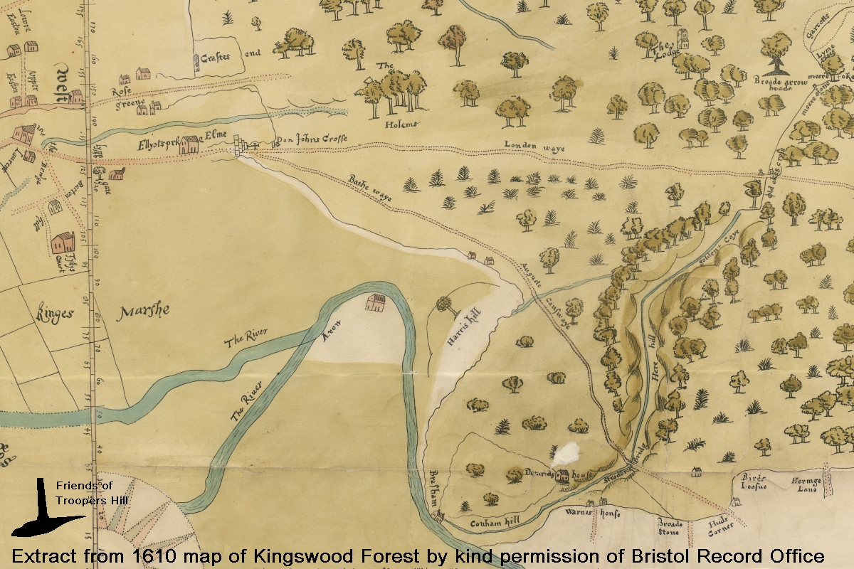 The area that is now known as Troopers Hill is on the edge of Kingswood Forest or Chase overlooking the river Avon. As can be seen from the extract shown on the right, the hill was named as 'Harris hill' on a map of Kingswood dated 1610. A larger section can be seen here. A later map of 1672 also shows 'Harris hill lands'. Many thanks to Bristol Record Office for allowing us to reproduce this extract of the colour map and also to Dundridge Park Group for finding it for us.