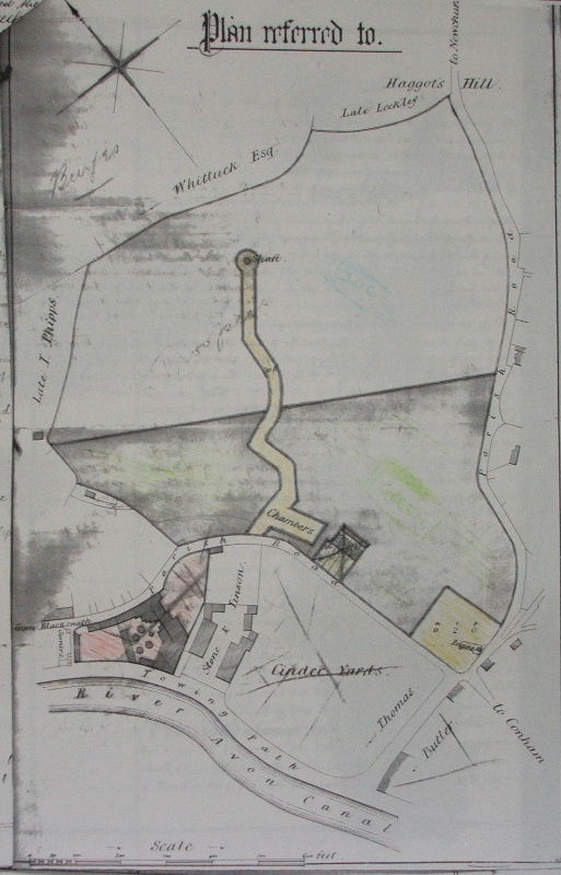 The plan shown here formed part of an 1886 lease of the land to the west of Stone and Tinson, together with mining rights under the hill, to the Bristol Fireclay Company. The lease is difficult to read but the wording was kindly typed for us by Margaret Watson from a copy given to us by the Council's property office, who have also given us permission to reproduce it. You can download a copy of the typed document here. In the lease the land is stated to have been formerly occupied by Mrs Elizabeth Braine and Ann Randall followed by Messrs Johnston Andrews & Company and then the Crown Clay Company. The plan shows the duct to the chimney, the cottages and the engine house as areas that shouldn't be undermined. The fireclay mines extended right under the hill and continued in use until they were abandoned in 1908. Two seams of clay were mined the five feet thick Dibb Clay and the deeper six feet thick Buff Clay. Two mine entrances were within the works area, while a third was in a quarry on the south-west side of the hill. Fireclay is often found below coal seems and it is possible that some of the works were opening up old coal mines.