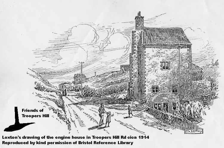 A second mine shaft and engine house was situated further up Troopers Hill Road and is shown in this drawing by Samuel Loxton from about 1914 (click on the drawing for a larger version). Both engine houses would have looked similar and the two shafts would have been linked below ground with one acting as the updraft ad one as the downdraft to ensure the mine was kept ventilated. In his book 'The Bristol Coalfield' John Cornwell refers to the Loxton drawing and says: 'A notable feature of the engine house is a large archway set in the side of the structure for installing and changing the cylinder of the engine, which is a feature of the early 19th century'.