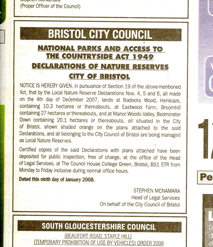 The good news for January was the official declaration of the Local Nature Reserves at Badock's Wood, Eastwood Farm and Manor Woods Valley. The official notice that was printed in the Evening Post on Tuesday 15 January can be seen here. It has taken a long time to get these declarations through the various legal processes but thanks to Sally's continuing efforts this has now been achieved and Bristol now officially has seven Local Nature Reserves.