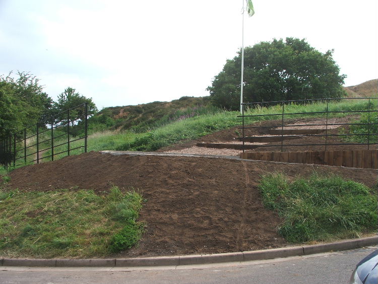 The original design brief that we prepared can be seen here. Given the topography of the hill it is obviously not appropriate to provide wheelchair access, but the new ramp and gate will make access easier and safer for all - especially parents with child buggies. The rotting wooden fence has been replaced with steel 'estate' type fencing. The final works, constructing and planting a bed with shrubs and some heather was completed in Autumn 2010, this was delayed from the Spring because of the unusually dry weather.
