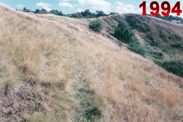 This photograph shows an area of the Hill where bell heather has spread significantly. The 1994 shot shows an area of grassland with scattered small plants of ling. Bell heather then colonised the area and has become much more abundant and vigorous in recent years. The hawthorn scrub in the centre right of the photo has also grown significantly over the last ten years. All these trends can be seen to have continued in the 2006 photo. |