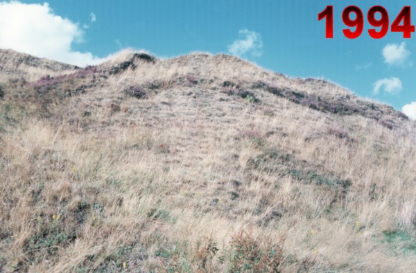 In 1994 ling was scattered accross this slope and formed a dense patch only around the bramble in the bottom left of the photograph. The area was affected by the fire in 1995 and since then the ling has spread quickly, and is now much more vigourous than it was in 1994. Bell heather colonised the area after 1996. Several plants of broom are now present, though the bramble is also spreading. The 2004 photograph is the same area but at a slightly different angle.