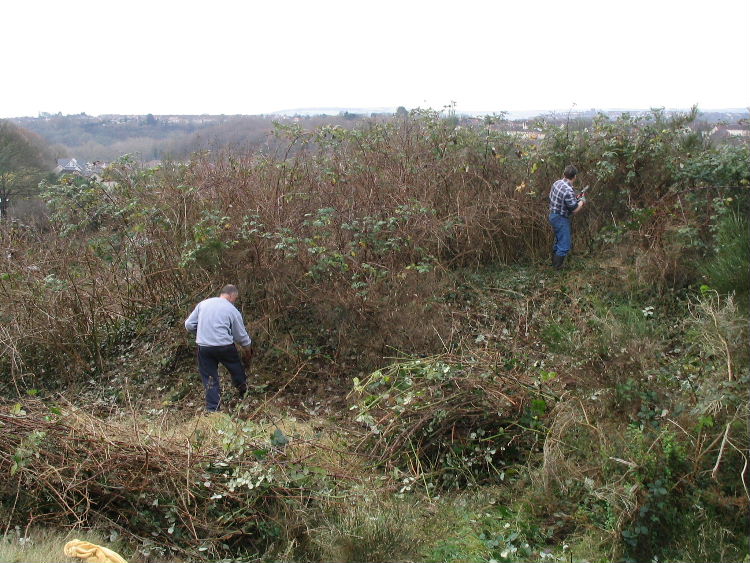 This was an extra Work Party arranged at our meeting on the previous Wednesday which discussed security on the hill following a recent incident. At the meeting it was decided that the bramble at the entrance from the Field should be cut back to make the entrance more open. This was to improve the view on to the hill from the Field, both to make it more welcoming and to remove an area where youths were able to gather out of sight of people using the path. The photographs show the area before and after the work was carried out. The area was inspected before the work was carried out in accordance with Bristol City Council's protocol to ensure that no birds were nesting in the bramble that we cleared.