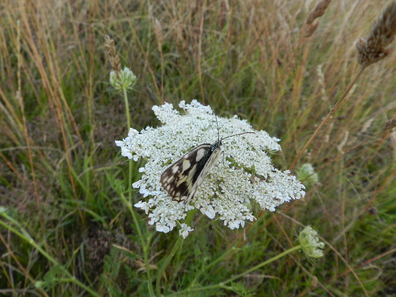 The perfume of the honeysuckle was very pleasant. We found a many-plumed moth there which was very satisfying as its caterpillar eats honeysuckle. There was also a large micro moth, Sitochroa palealis, which was the first of these Rupert had seen for many years and was also probably a new record for the hill.