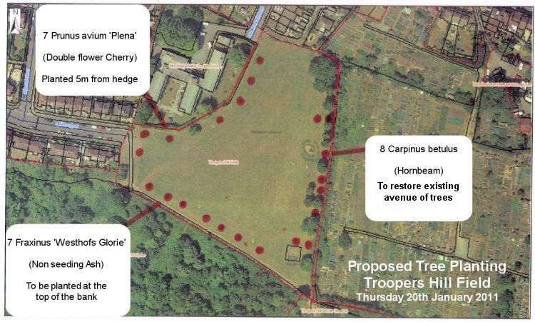 Since this planting scheme was carried out TreeBristol have planted two more memorial trees in Troopers Hill Field to replace two trees lost to strong winds, two of the smaller whips that did not survive have also been replaced.