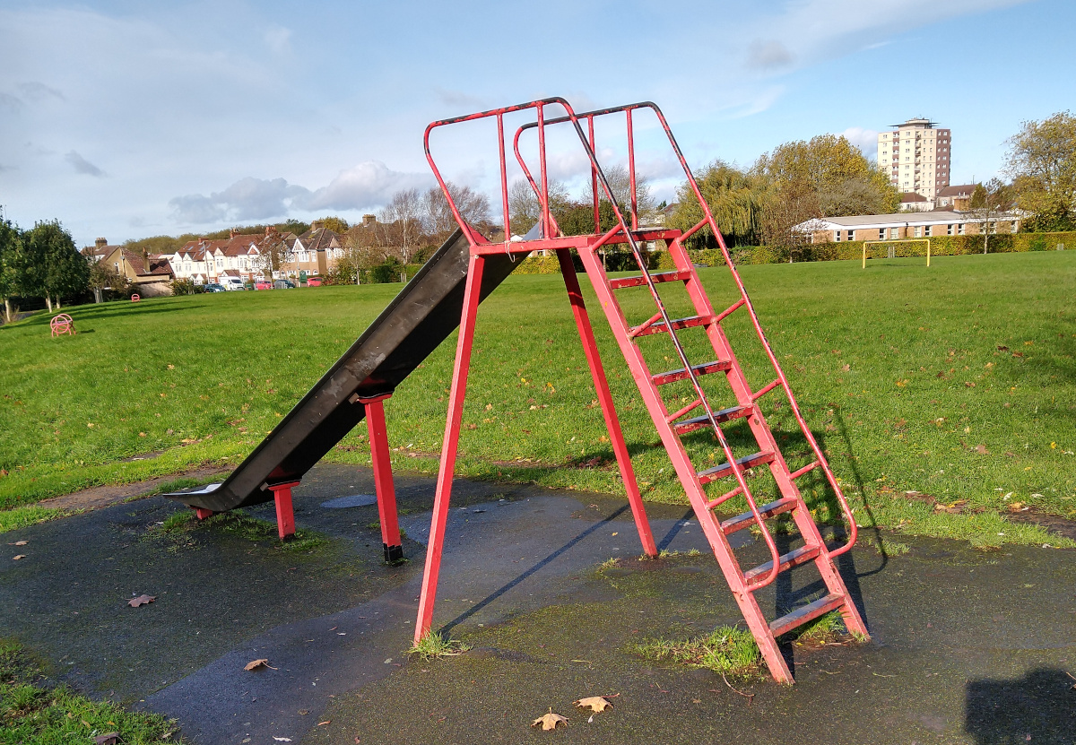 Play equipment was installed (in 1980 or earlier) with a slide, swings and roundabout - these can be seen in the photos below taken in 1981 and also in the bottom of this set of photographs. This play equipment was gradually removed as it became worn out or damaged, the Red Slide survived until 2019.