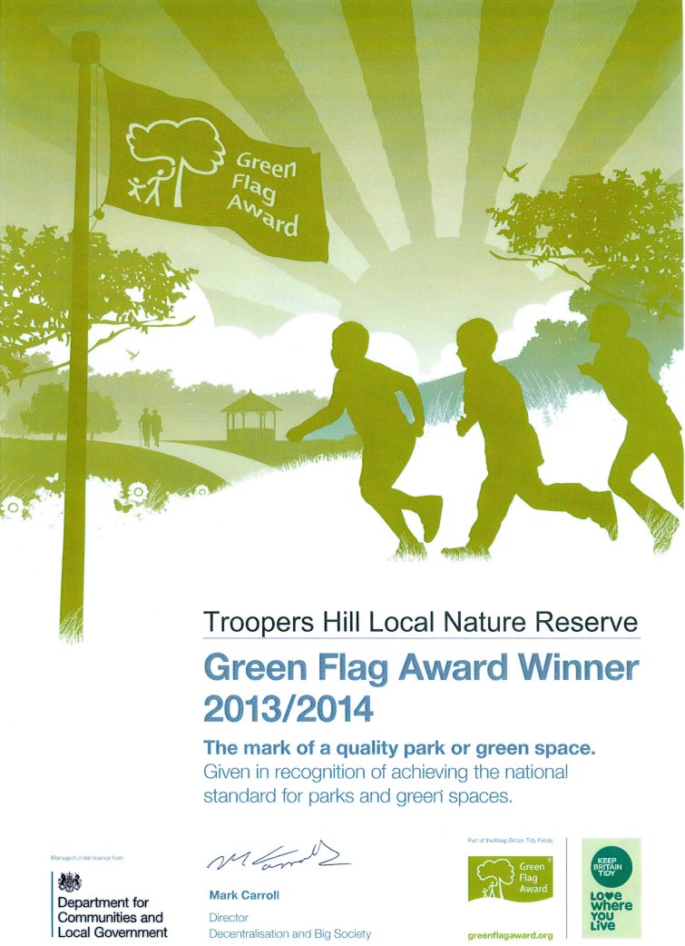 Green Flags are a national award scheme for quality green spaces; Troopers Hill was successfully entered by Bristol Parks in each year from 2007 to 2013. Two sites were entered in 2007 (Troopers Hill and The Downs). The number of Bristol entries then increased year on year so that in 2013 Troopers Hill one of 11 parks in Bristol to be awarded a flag, but the only nature reserve.