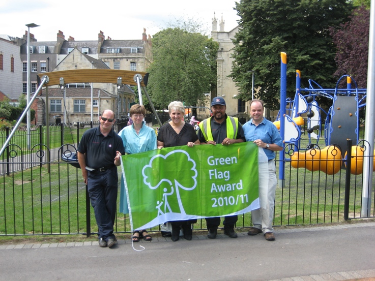 This year's Green Flags were presented at St Paul's Park at lunchtime on 28 July. Entertainment was provided by Circomedia. The photograph shows, Julian, Susan, Tracey Morgan (Service Director - Environment & Leisure), Keith & Rob with the flag and the new St Paul's play area in the background (click on photo to enlarge).